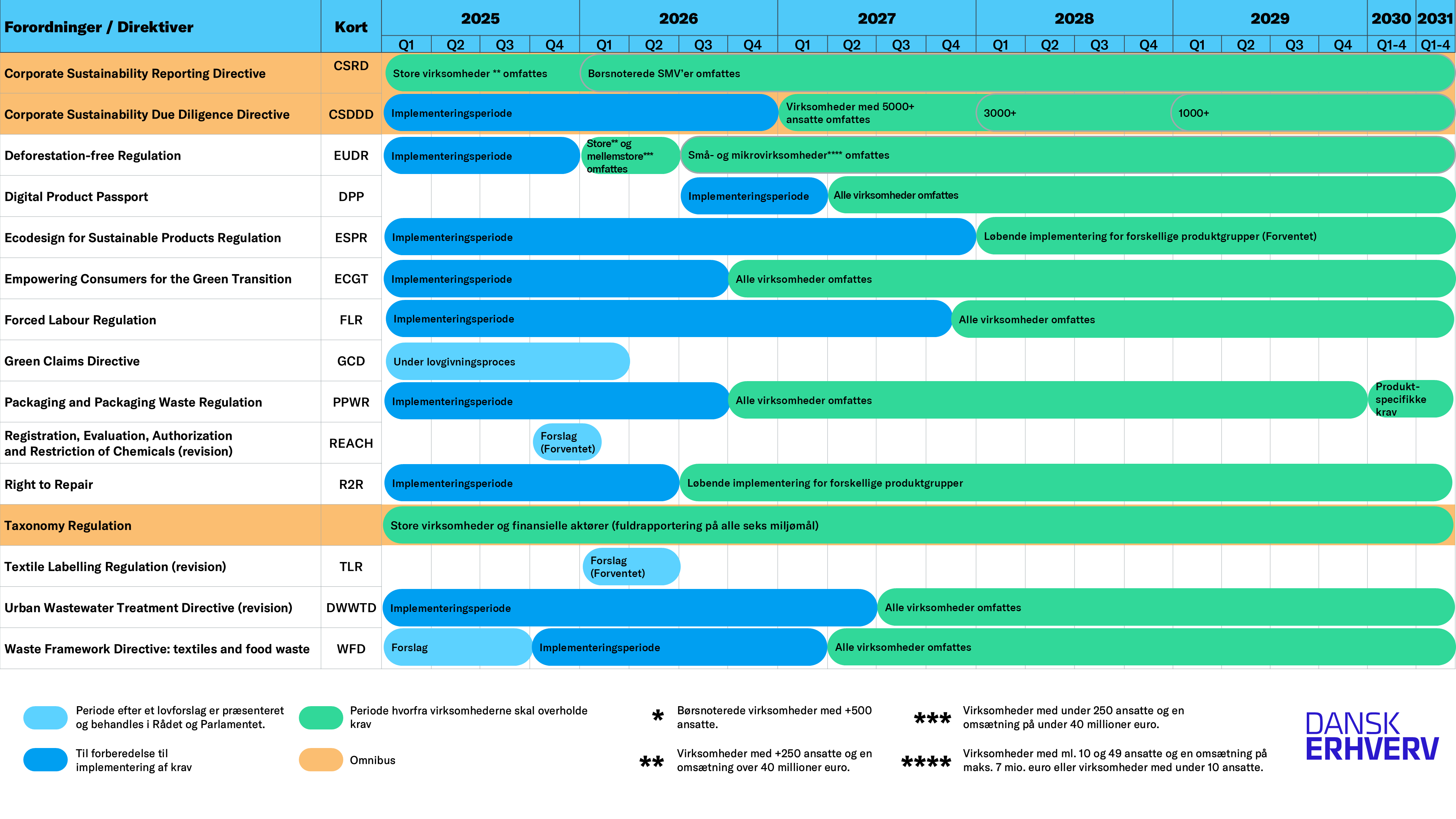 - Q2 2028: Forventet ikrafttrædelse i Danmark. Herefter vil virksomhederne være forpligtet til at leve op til kravene i producentansvaret
