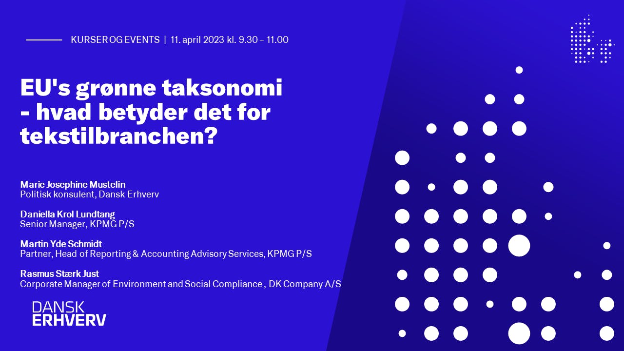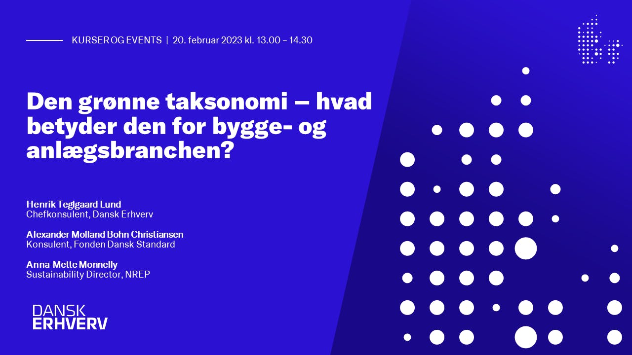 Dansk Erhverv faciliterer en række webinarer og andre arrangementer, som giver ny viden, inspiration og vejledning til at klæde virksomheden på i den grønne omstilling: Fra de kommende lovkrav om rapportering, til hvordan du kan gøre den grønne dagsorden til en del af din forretning, eksempelvis når det handler om strategi, finansiering eller kommunikation. Vi har sat nogle af landet fremmeste specialister, rådgivende aktører og virksomheder i scene til at vejlede og inspirere dig og din virksomhed i de konkrete arrangementer.