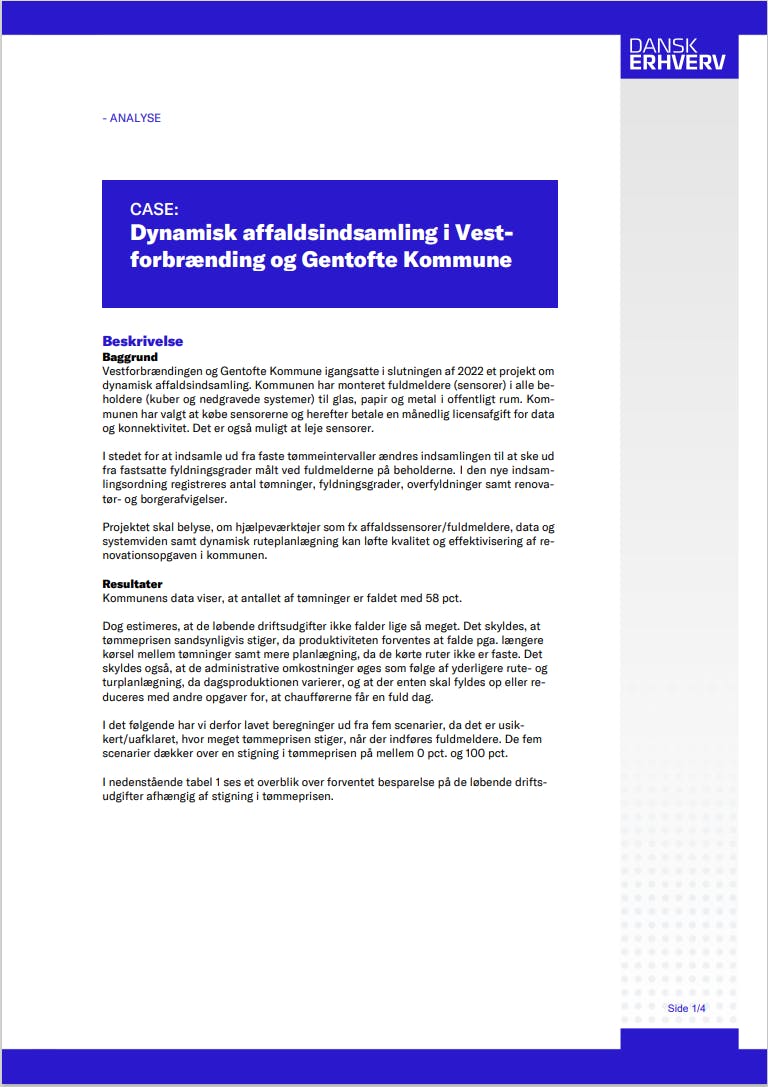 En ny undersøgelse fra Dansk Erhverv viser, at Gentofte Kommune og Vestforbrænding har nedbragt antallet af tømninger af affaldsbeholdere til glas, papir og metal i offentligt rum med 58 pct. ved brug af IoT og dataanalyse. Det samlede antal kørte kilometer inkl. transport til og fra behandlingsanlæg er faldet med 21 pct.