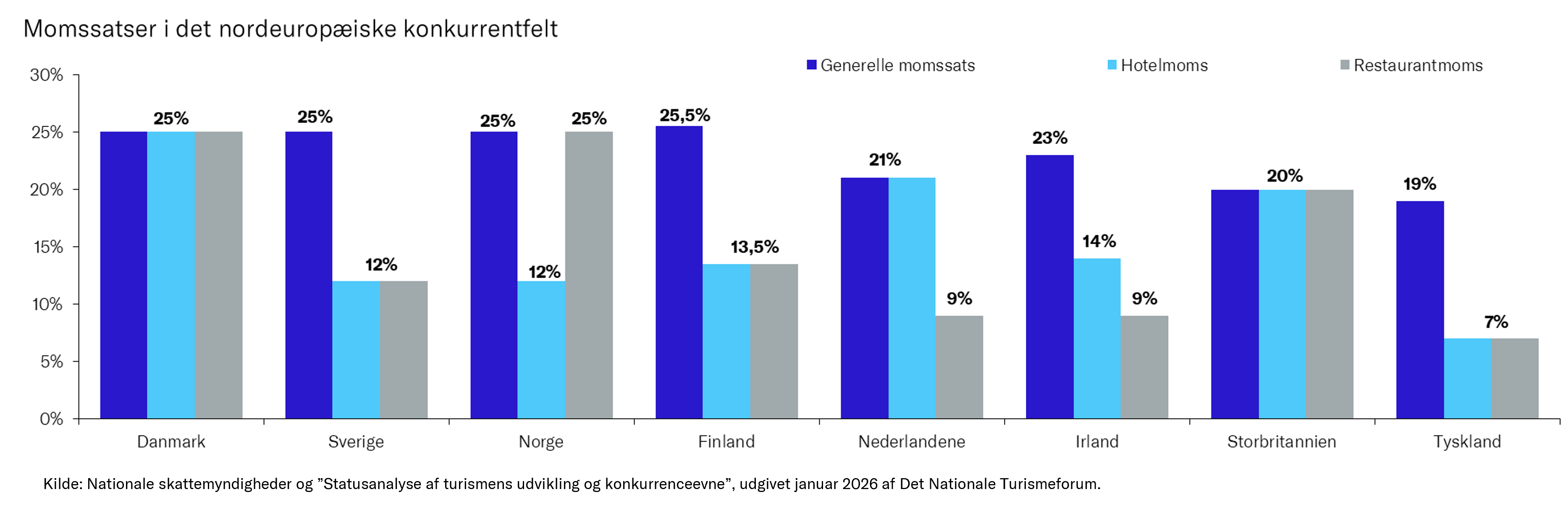 I Danmark er enhedsmomssatsen på varer og tjenesteydelser 25 pct. Det er en høj sats sammenlignet med vores konkurrenter i Nordeuropa.