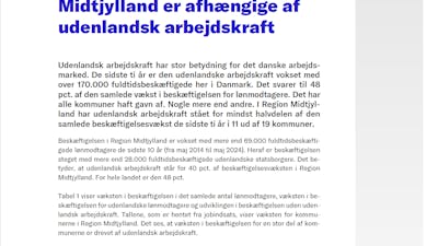 Udenlandsk arbejdskraft har stor betydning for det danske arbejdsmarked. De sidste ti år er den udenlandske arbejdskraft vokset med over 170.000 fuldtidsbeskæftigede her i Danmark. Det svarer til 48 pct. af den samlede vækst i beskæftigelsen for lønmodtagere. Det har alle kommuner haft gavn af. Nogle mere end andre. I Region Midtjylland har udenlandsk arbejdskraft stået for mindst halvdelen af den samlede beskæftigelsesvækst de sidste ti år i 11 ud af 19 kommuner.