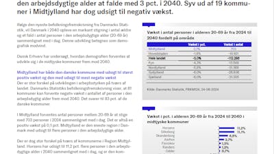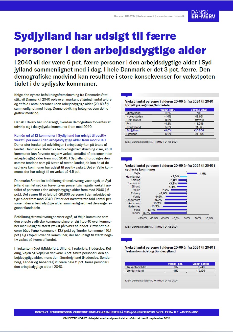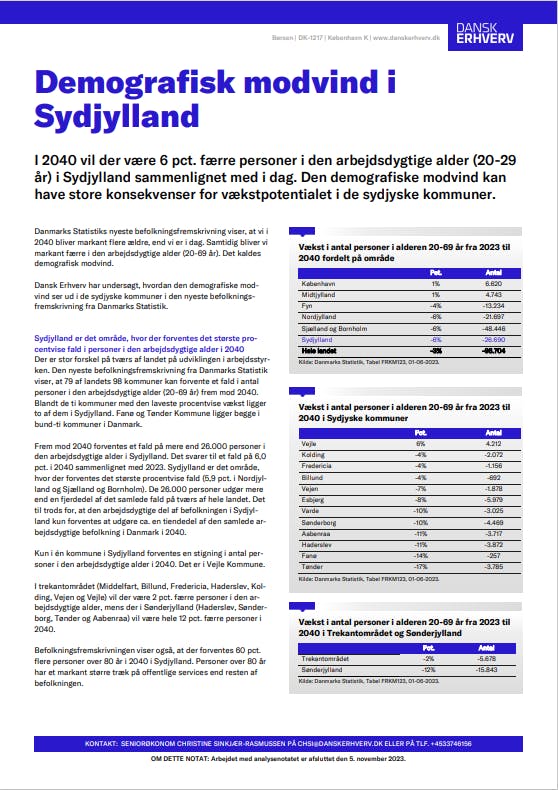I 2040 vil der være 6 pct. færre personer i den arbejdsdygtige alder i Sydjylland sammenlignet med i dag. I hele Danmark er det 3 pct. færre. Den demografiske modvind kan resultere i store konsekvenser for vækstpotentialet i de sydjyske kommuner.