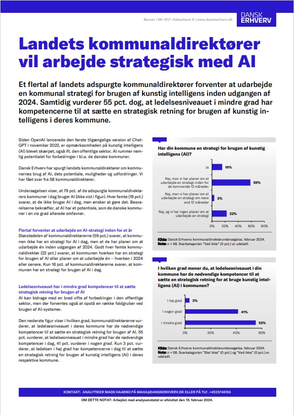 Kunstig intelligens kan være med til at frigøre ressourcer fra administrative opgaver. Ny analyse fra Dansk Erhverv viser, at et flertal af landets kommunaldirektører vurderer, at kunstig intelligens kan frigøre ressourcer fra kommunernes administration, som er en væsentlig udgiftspost for de danske kommuner. Desuden forventer et flertal af landets adspurgte kommunaldirektører at udarbejde en kommunal strategi for brugen af kunstig intelligens inden udgangen af 2024.