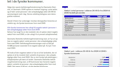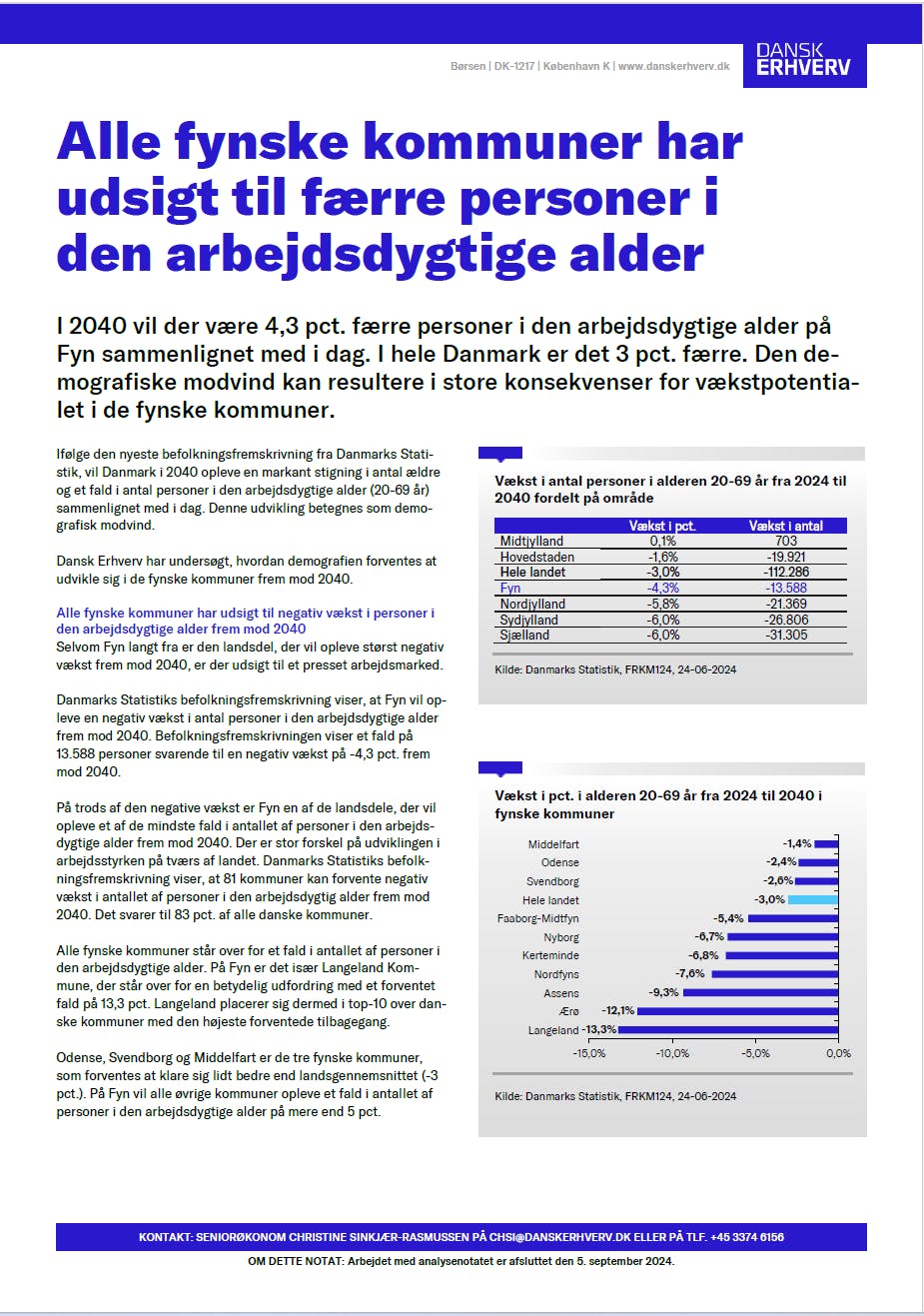 I 2040 vil der være 4,3 pct. færre personer i den arbejdsdygtige alder på Fyn sammenlignet med i dag. I hele Danmark er det 3 pct. færre. Den demografiske modvind kan resultere i store konsekvenser for vækstpotentialet i de fynske kommuner.