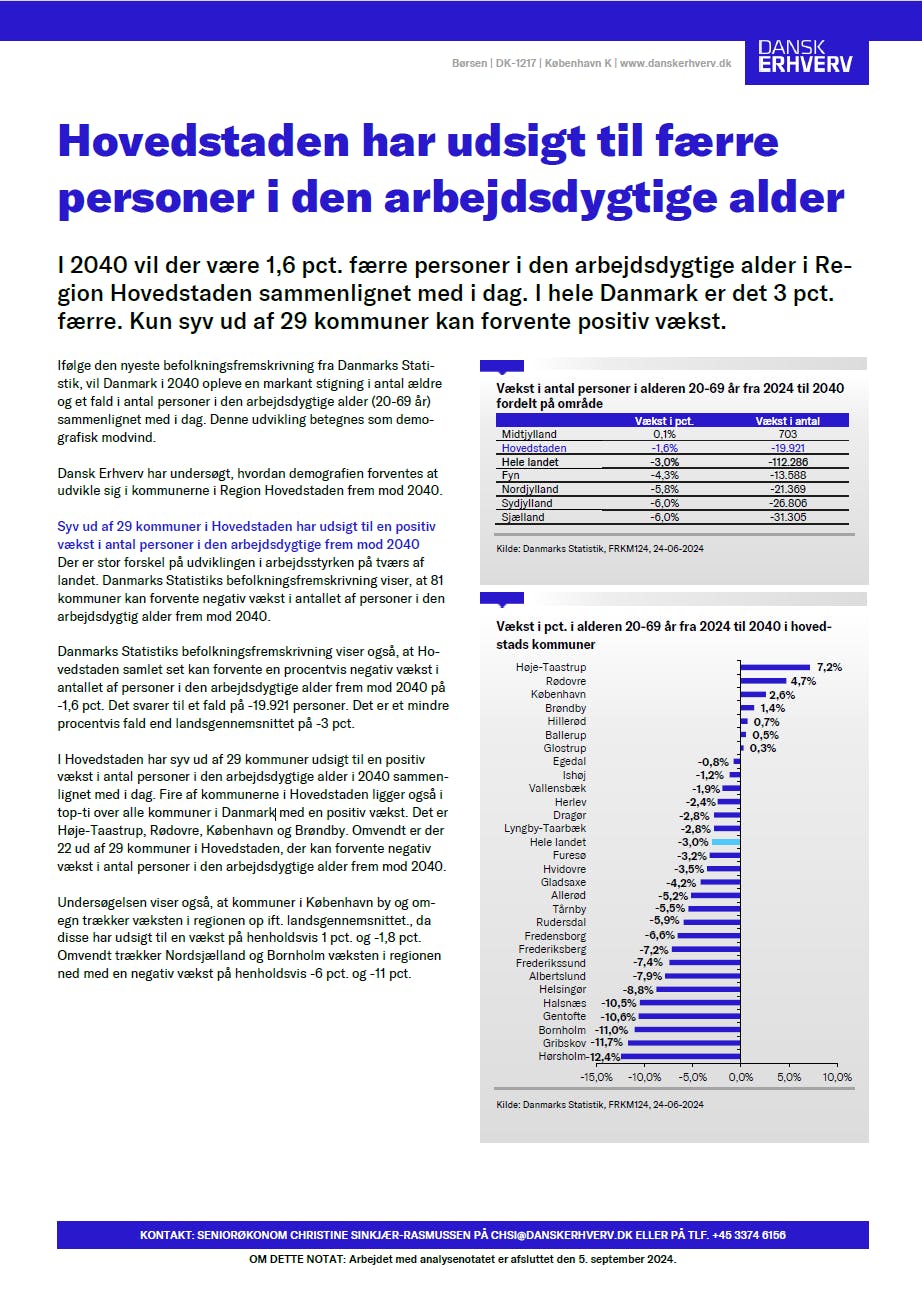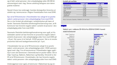 I 2040 vil der være 1,6 pct. færre personer i den arbejdsdygtige alder i Region Hovedstaden sammenlignet med i dag. I hele Danmark er det 3 pct. færre. Kun syv ud af 29 kommuner kan forvente positiv vækst.