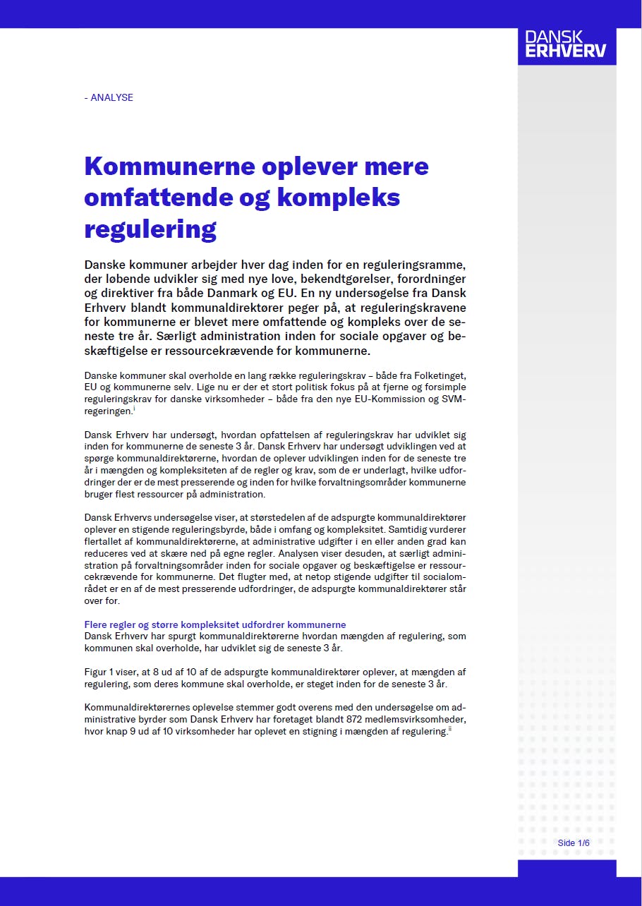 Kunstig intelligens kan være med til at frigøre ressourcer fra administrative opgaver. Ny analyse fra Dansk Erhverv viser, at et flertal af landets kommunaldirektører vurderer, at kunstig intelligens kan frigøre ressourcer fra kommunernes administration, som er en væsentlig udgiftspost for de danske kommuner. AI vurderes også at kunne afhjælpe manglen på arbejdskraft i det offentlige.