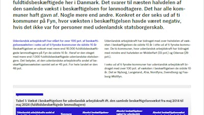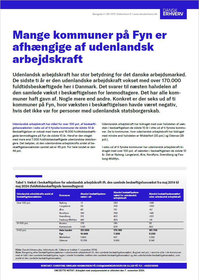 Udenlandsk arbejdskraft har stor betydning for det danske arbejdsmarked. De sidste ti år er den udenlandske arbejdskraft vokset med over 170.000 fuldtidsbeskæftigede her i Danmark. Det svarer til næsten halvdelen af den samlede vækst i beskæftigelsen for lønmodtagere. Det har alle kommuner haft gavn af. Nogle mere end andre. Konkret er der seks ud af ti kommuner på Fyn, hvor væksten i beskæftigelsen havde været negativ, hvis det ikke var for personer med udenlandsk statsborgerskab.