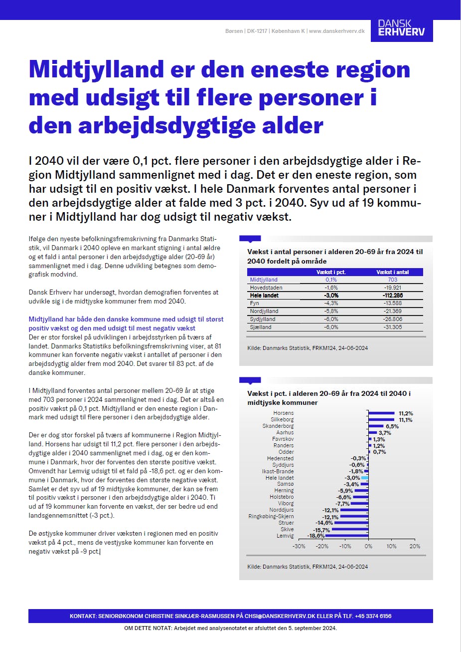 I 2040 vil der være 0,1 pct. flere personer i den arbejdsdygtige alder i Region Midtjylland sammenlignet med i dag. Det er den eneste region, som har udsigt til en positiv vækst. I hele Danmark forventes antal personer i den arbejdsdygtige alder at falde med 3 pct. i 2040. Syv ud af 19 kommuner i Midtjylland har dog udsigt til negativ vækst.