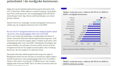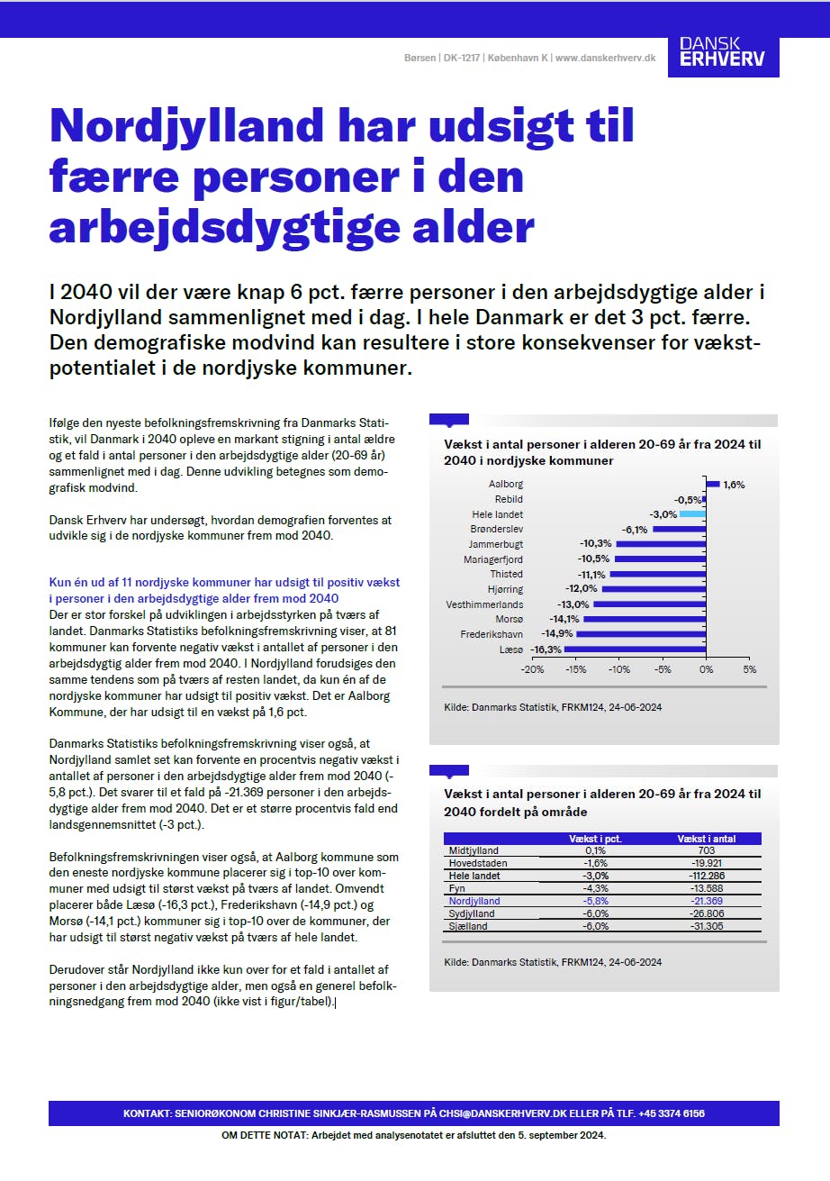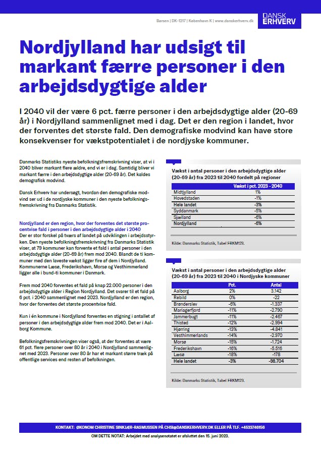 I 2040 vil der være knap 6 pct. færre personer i den arbejdsdygtige alder i Nordjylland sammenlignet med i dag. I hele Danmark er det 3 pct. færre. Den demografiske modvind kan resultere i store konsekvenser for vækstpotentialet i de nordjyske kommuner.