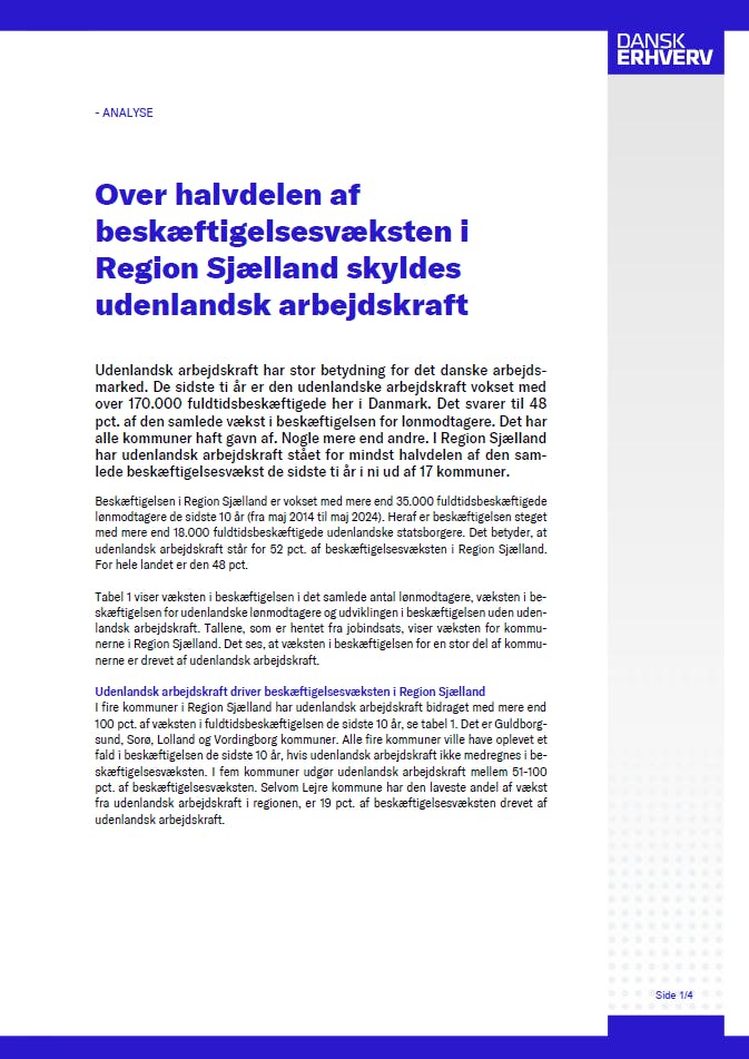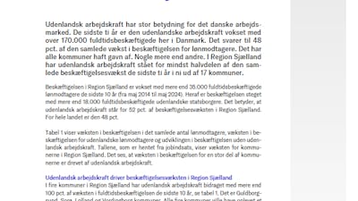 Udenlandsk arbejdskraft har stor betydning for det danske arbejdsmarked. De sidste ti år er den udenlandske arbejdskraft vokset med over 170.000 fuldtidsbeskæftigede her i Danmark. Det svarer til 48 pct. af den samlede vækst i beskæftigelsen for lønmodtagere. Det har alle kommuner haft gavn af. Nogle mere end andre. I Region Sjælland har udenlandsk arbejdskraft stået for mindst halvdelen af den samlede beskæftigelsesvækst de sidste ti år i ni ud af 17 kommuner.