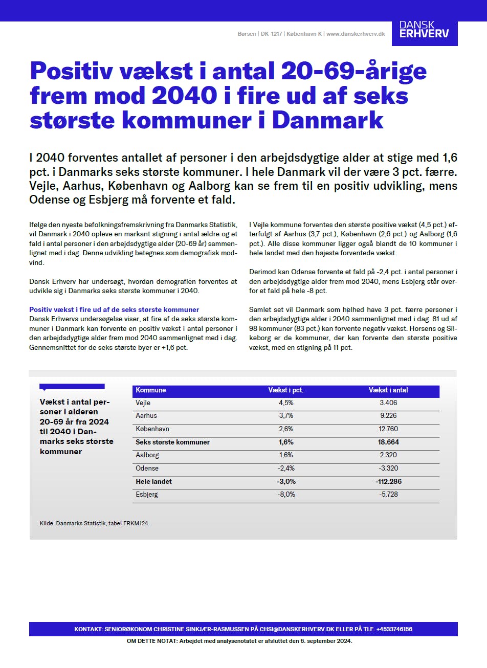 I 2040 forventes antallet af personer i den arbejdsdygtige alder at stige med 1,6 pct. i Danmarks seks største kommuner. I hele Danmark vil der være 3 pct. færre. Vejle, Aarhus, København og Aalborg kan se frem til en positiv udvikling, mens Odense og Esbjerg må forvente et fald.