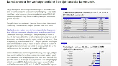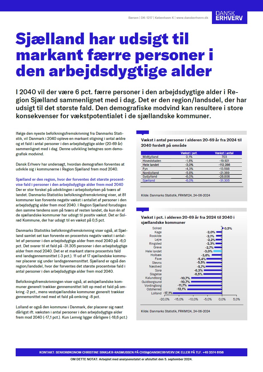 I 2040 vil der være 6 pct. færre personer i den arbejdsdygtige alder i Region Sjælland sammenlignet med i dag. Det er den region/landsdel, der har udsigt til det største fald. Den demografiske modvind kan resultere i store konsekvenser for vækstpotentialet i de sjællandske kommuner.