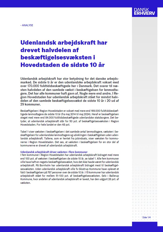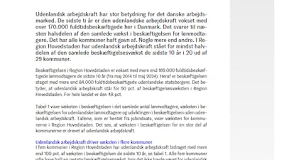 Udenlandsk arbejdskraft har stor betydning for det danske arbejdsmarked. De sidste ti år er den udenlandske arbejdskraft vokset med over 170.000 fuldtidsbeskæftigede her i Danmark. Det svarer til næsten halvdelen af den samlede vækst i beskæftigelsen for lønmodtagere. Det har alle kommuner haft gavn af. Nogle mere end andre. I Region Hovedstaden har udenlandsk arbejdskraft stået for mindst halvdelen af den samlede beskæftigelsesvækst de sidste 10 år i 20 ud af 29 kommuner.