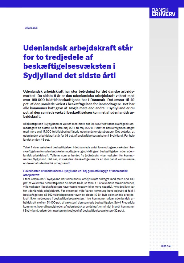 Udenlandsk arbejdskraft har stor betydning for det danske arbejdsmarked. De sidste ti år er den udenlandske arbejdskraft vokset med over 170.000 fuldtidsbeskæftigede her i Danmark. Det svarer til næsten halvdelen af den samlede vækst i beskæftigelsen for lønmodtagere. Det har alle kommuner haft gavn af. Nogle mere end andre.