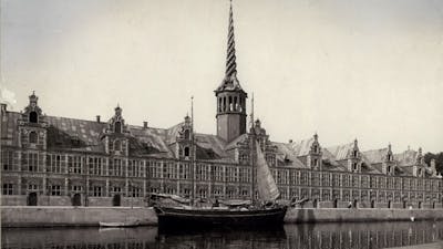 In 1620, construction was begun of a long building on an embankment facing the Christianshavn quarter. Peasants from the town of Roskilde and Copenhagen’s surrounding area were ordered to drive in four wagon loads of boulders for the embankment’s foundations. The construction work was led by master builder Hans Steenwinckel, and the building’s architecture was inspired by Dutch Renaissance architecture, with sandstone bands and stone figures. Timber and sandstone came from Gotland, and the bricks from Holland.