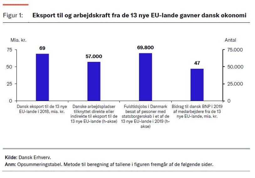 Dansk økonomi har stor gavn af at handle med de 13 nye EU-lande. Sidste år eksporterede danske virksomheder for 69 mia. kr. til de nye medlemmer. Det gjorde at 57.000 arbejdspladser i Danmark var direkte eller indirekte tilknyttet eksport til de 13 lande.