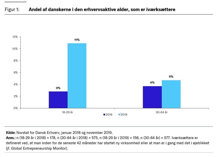 Inden for de seneste år er der sket en betydelig stigning i andelen af unge under 30 år, som starter ny virksomhed. Primo 2018 var kun 3 pct. af de unge under 30 år iværksættere, mens andelen ultimo 2019 var steget til 11 pct. Det er også markant flere end blandt de ældre danskere i alderen 30-64 år, hvor der begge år kun er 4-5 pct., som er iværksættere.