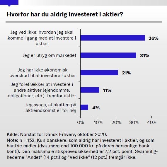 Vi har spurgt danskere med frie midler, hvorfor de ikke har investeret i aktier. Den barriere, som flest nævner er, at de ikke ved, hvordan de skal komme i gang. Dette gælder for 36 pct.