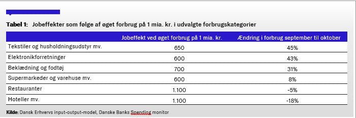 Grunden til at vi forventer en skuffende lav beskæftigelseseffekt er, at danskerne i høj grad har øget forbruget i brancher, hvor der er en høj omsætning i forhold til antallet af medarbejdere.Tal fra Danske Banks Spending monitor viser, at danskerne særligt har øget forbruget af elektronik og husholdningsudstyr i oktober. Konkret er danskernes køb af husholdningsudstyr og elektronik steget med hhv. 45% og 43% fra september til oktober. Her er omsætningen per medarbejder typisk i den høje ende. Beregninger viser, at et øget forbrug på 1 mia. kr. vil skabe ca. 650 fuldtidsjobs i de forretninger, der forhandler tekstiler og husholdningsudstyr. En lignende jobeffekt ses hos elektronikforretningerne, hvor en stigning i forbruget på 1 mia. kr. skaber 600 fuldtidsjobs.