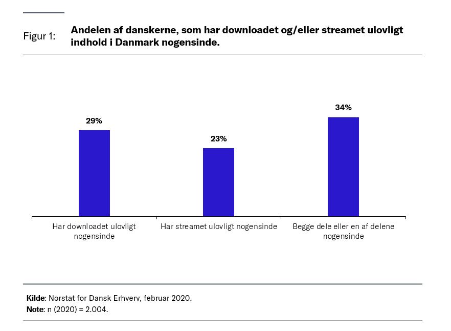 Danskerne foretager stadig ulovlig streaming og download i stort omfang. Hver ottende dansker har således downloadet eller streamet ulovligt indenfor det seneste år. Det viser, at der i Danmark fortsat er et betydeligt ulovligt forbrug af digitalt indhold på nettet. Det er særligt danskere under 30 år, som streamer og downloader ulovligt. Der er således 41 pct. af de 18-29-årige, som har downloadet eller streamet ulovligt indenfor de seneste 12 måneder. I Dansk Erhvervs analyse fra 2018 var det tilsvarende tal 28 pct., hvilket tyder på en vækst i ulovligt forbrug blandt de yngste, voksne danskere.