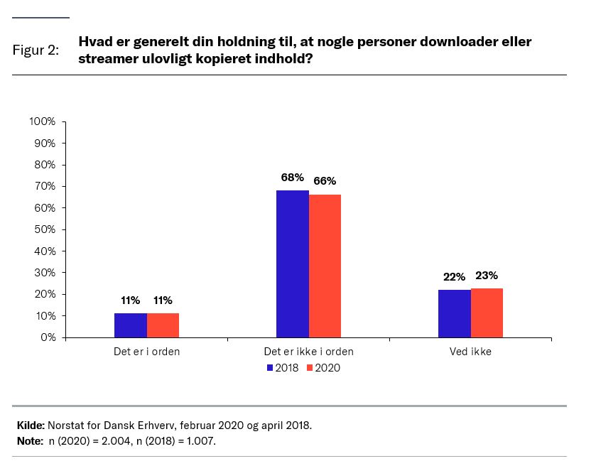 Danskerne fortsætter ufortrødent med at streame og downloade ulovligt på nettet og det kan skyldes, at de i vid udstrækning mener, at ulovlig streaming og download er i orden. Undersøgelsen viser, at hver tiende dansker stadig synes, at det er i orden at streame eller downloade ulovligt, mens hver femte dansker ikke har en klar holdning til spørgsmålet. Når en tredjedel af danskerne ikke tager klart afstand fra ulovligt brug af digitalt indhold på nettet, kan det bidrage til at forklare, hvorfor så mange danskere stadig bryder loven på nettet.