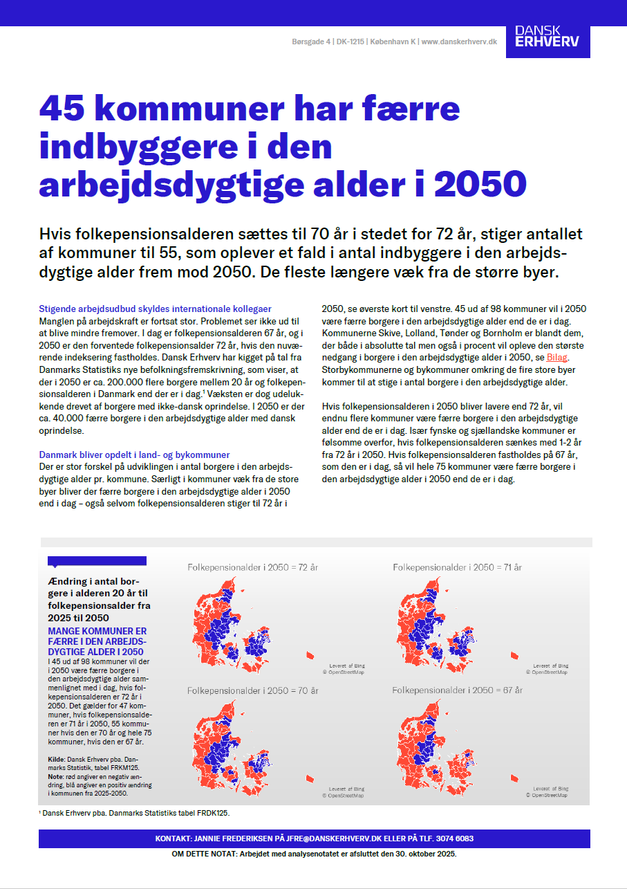 Hvis folkepensionsalderen sættes til 70 år i stedet for 72 år, stiger antallet af kommuner til 55, som oplever et fald i antal indbyggere i den arbejdsdygti...