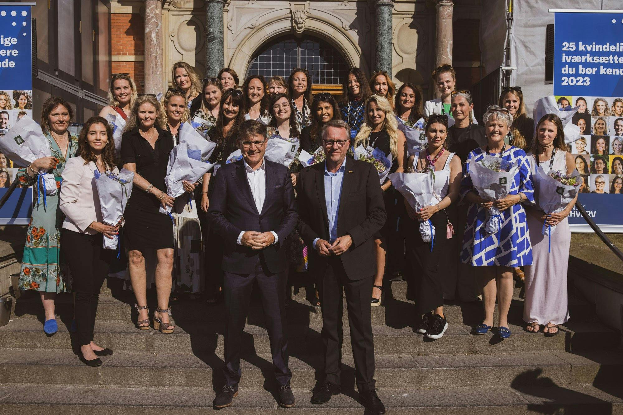 Drevne iværksættere blev tirsdag eftermiddag hyldet af Dansk Erhverv, da adm. direktør Brian Mikkelsen og erhvervsminister Morten Bødskov (S) overrakte blomster til 25 kvindelige iværksættere, du bør kende 2023.