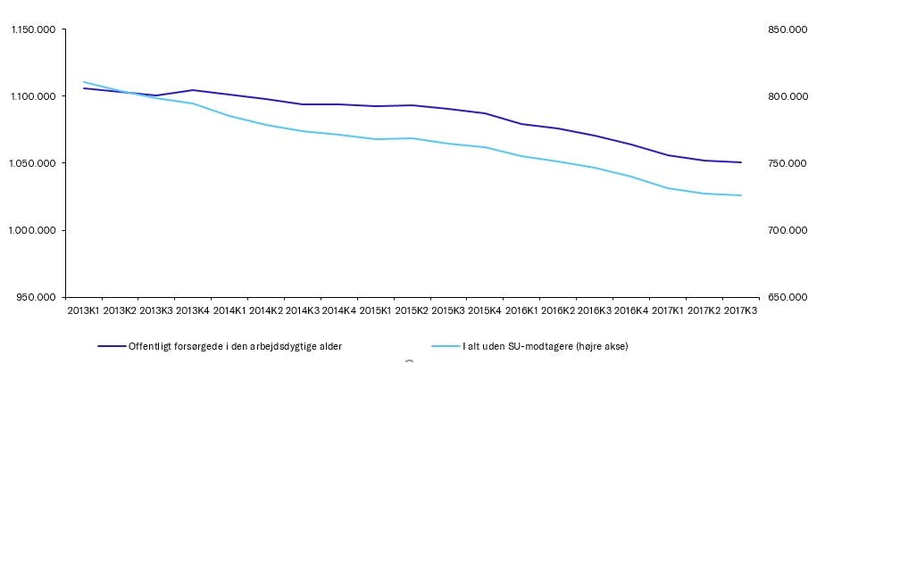 Over de seneste år er antallet af danskere på offentlig forsørgelse faldet støt. Når det er sagt, så er niveauet fortsat betydeligt højere end inden krisen – faktisk næsten 100.000 personer. Det skyldes dog i høj grad at flere er på SU end i 2008, og det er dermed ikke udtryk for et stort problem.