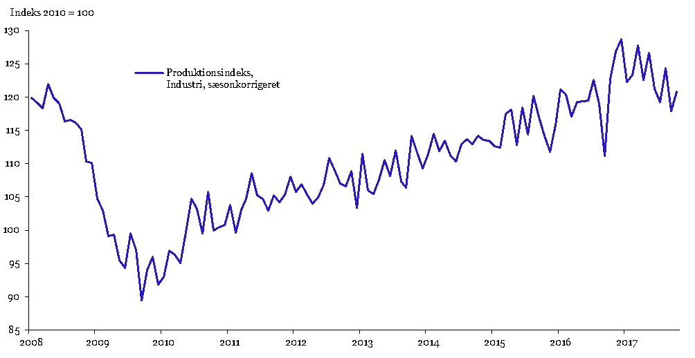 Målt over det seneste år er væksten på 0,5 pct. – mens niveauet for industriproduktionen er fortsat betydeligt lavere end ved udgangen af 2016. Faktisk er industriproduktionen i oktober i år 6,1 pct. lavere end i december sidste år.