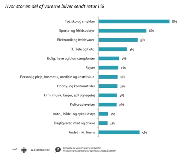 ”Dur ikke – retur”. Sådan lyder det fra flere og flere danskere, der handler på nettet. Andelen af varer, der sendes retur, er nemlig steget fra 2,5 % i 2015 til 3,8 % i 2016, viser E-handelsanalysen: