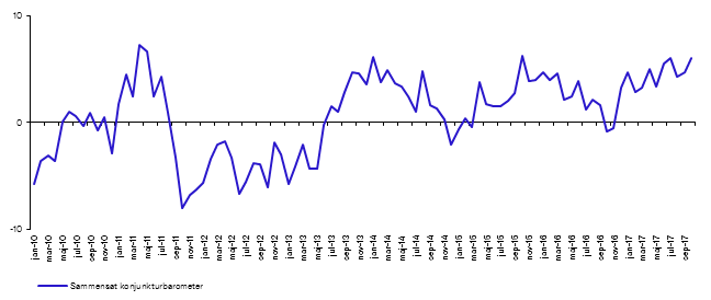Det største hop op i erhvervstilliden så vi dog i detailhandlen, hvor indekset sæsonkorrigeret steg fra 0,6 i september til 7,3 i oktober. Sammenvejer vi de fire indeks for erhvervstilliden til et samlet sammensat konjunkturbarometer, så er der ingen tvivl om, at dansk erhvervsliv fandt smilene frem i oktober. Det sammensatte konjunkturbarometer steg således fra 4,7 i september til 6,1 i oktober. Vi skal tilbage til oktober sidste år for at finde et tilsvarende højt indeks for erhvervslivet samlet set.