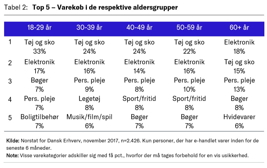Tøj og sko er de mest populære varetyper på tværs af alder, målt på antal køb, bortset fra i aldersgruppen 60+, hvor førstepladsen bliver indtaget af elektronik. Den største andel af køb af tøj og sko er blandt de yngre. Elektronik og produkter til personlig pleje figurerer også i top 5 for alle aldersgrupper, imens bøger, som noget nyt i forhold til 2016, indgår i top 5 for alle, bortset fra de 30-39-årige, som også er den gruppe, der ofte har små børn og dermed sandsynligvis heller ikke i samme grad har tid til at læse. Til gengæld figurerer varegruppen ”legetøj og udstyr til børn” for denne aldersgruppe.