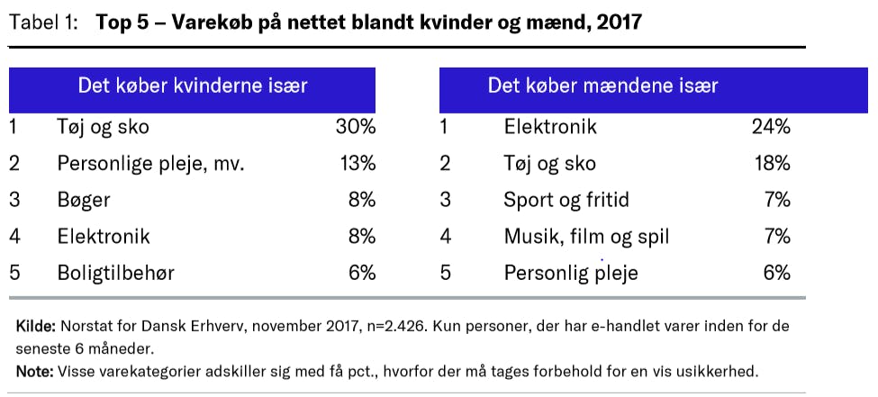 Hos mændene er det især elektronik, der hitter. Hvert fjerde e-køb foretaget af en mand er elektronik. På mændenes andenplads ser vi tøj og sko. Derudover er varegrupperne hvidevarer og husholdningsartikler samt dagligvarer, der var i top 5 i 2016, blevet skiftet ud med fysisk levering af musik, film og spil samt produkter til personlig pleje, lægemidler og kosttilskud i 2017 hos de mandlige e-handlere.