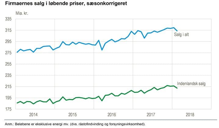 Danmarks Statistik offentliggjorde torsdag tal for virksomhedernes salg frem til og med februar i år. Tallene viste, at firmaernes samlede salg ekskl. energi faldt med 1,7 pct. fra januar til februar, når der tages højde for sæsonudsving og effekten af handelsdage.