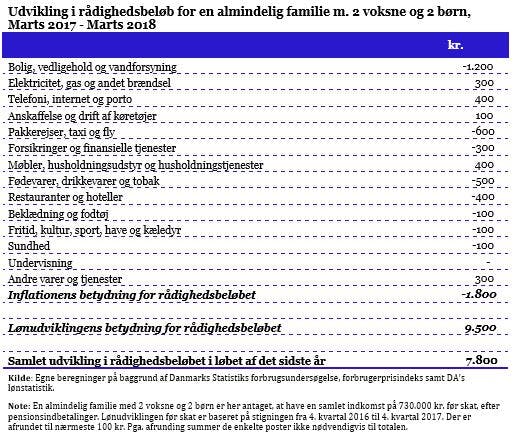 Når man ser, hvad inflationen betyder for en almindelig husholdning med 2 voksne og 2 børn og en årlig indkomst på 730.000 kr. før skat, så kan vi se, at rådighedsbeløbet blot bliver udhulet med ca. 1.800 kr. på årsbasis. (jf. tabellen nedenfor). Når der tages højde for at lønnen stiger mere, betyder det at en almindelig familie samlet vil opleve fremgang i rådighedsbeløbet på ca. 7.800 kr. Det er en meget pæn fremgang i rådighedsbeløbet, der giver muligheder for fremgang i de private forbrugsmuligheder for den enkelte familie.