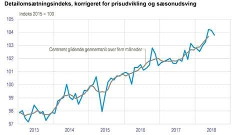 Overordnet har detailsalget været pænt stigende i 2018, og selv med faldet i juli er det nuværende niveau for detailsalget et pænt stykke højere, end det var på noget tidspunkt af 2017. Med de for tiden solide privatøkonomiske forudsætninger vil man også forvente, at salget i de danske detailbutikker er stigende. Et kraftigt opsving i beskæftigelsen kombineret med, at lønningerne stiger mere end priserne, har givet luft i de danske husholdningsbudgetter, og der er dermed også plads til højere forbrug.