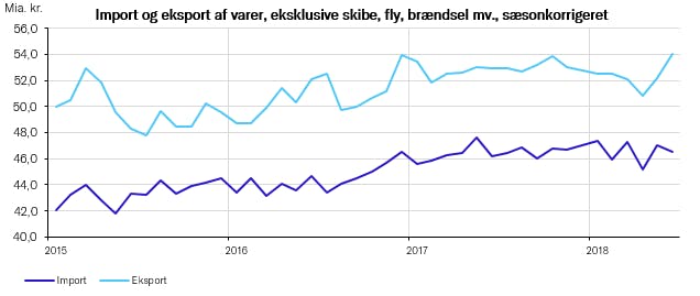 Torsdagens tal viser dog, at vareeksporten i juni stiger for anden måned i træk. Eksporten af varer ekskl. brændsel, skibe og fly steg med 3,5 pct. fra maj til juni, når der tages højde for den normale effekt af sæson – det er anden måned i træk, at vi ser en pæn vækst i eksporten ekskl. skibe. Eksporten i juni ligger dermed på niveau med efteråret sidste år. Fra 1. kvartal til 2. kvartal faldt eksporten af varer ekskl. skibe. med -0,1 pct. Dermed skal man ikke forvente et stort bidrag til den samlede danske vækst i 2. kvartal.