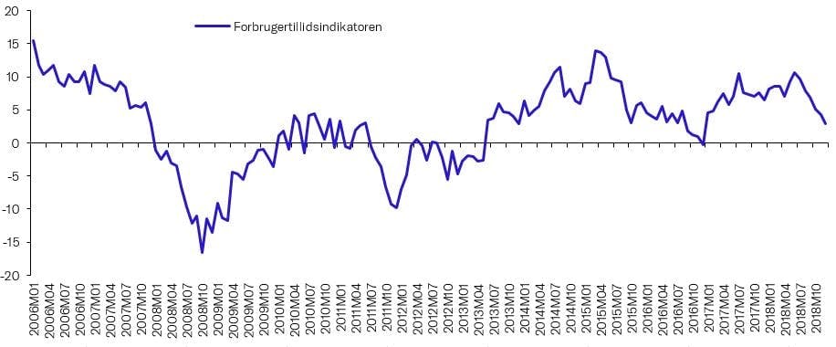 Danmarks Statistik offentliggjorde fredag tal for forbrugertilliden frem til og med december i år. Tallene viser, at forbrugertilliden faldt til et niveau på 2,9 i december sammenlignet med 4,3 i november. Forbrugernes økonomiske forventninger ligger i øjeblikket på det laveste niveau vi har set siden slutningen af 2016.