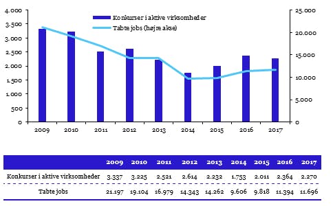 I 2017 var der 2.270 konkurser blandt aktive virksomheder. Det er et fald på lige under 100 konkurser i forhold til 2016, hvilket svarer til 4 pct. færre konkurser. Det skal dog nævnes, at konkurstallet i 2016 blev en smule kunstigt løftet op, da IT-problemer medførte, at nogle konkursbehandlinger blev skubbet fra 2015 til 2016. På trods af at antallet af konkurser blandt aktive virksomheder er faldet på årsbasis, så var der i 2017 flere jobs der gik tabt i forbindelse med konkurser i forhold til i 2016. Knap 11.700 tabte jobs kom vi op på i 2017 – det er omkring 300 flere end i 2016, svarende til en stigning på ca. 3 pct..