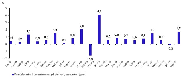 Vi skal ikke længere tilbage end til efteråret 2015 for at finde en højere årsvækst i omsætningen på Dankort. Den moderate vækst i omsætningen på Dankort skal dog i høj grad ses i lyset af en skuffende udvikling i det private forbrug i 2. og 3. kvartal – i 3. kvartal faldt omsætningen på Dankort således i forhold til kvartalet før – det er ikke særligt ofte vi ser det i dansk økonomi.