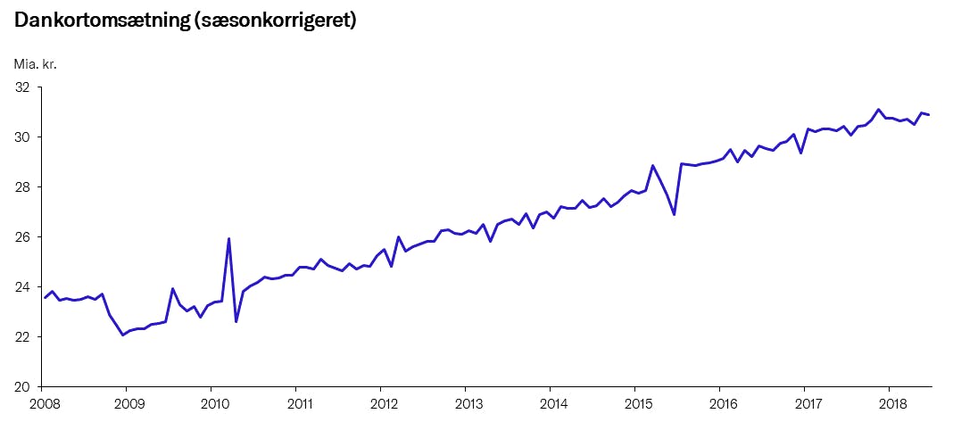 De nye tal viser, at den samlede dankortomsætning blev på knap 30,9 mia. kr. i juni, når der tages højde for almindelige sæsonudsving. Det er et lille fald på 0,3 pct. sammenlignet med maj, hvor shoppelysten var steget i det gode majvejr. På trods af det mindre fald i juni måned er niveauet 1,5 pct. højere end juni måned for et år siden.