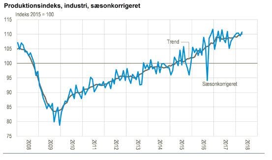Betragter vi de seneste 3 måneder (februar-april), så steg industriproduktionen med 0,6 pct. ift. foregående tre måneder. Overordnet set er der tegn på en lille stigning i 2018 i den underliggende udvikling, men industriproduktionen er ikke for alvor steget siden starten af 2017.