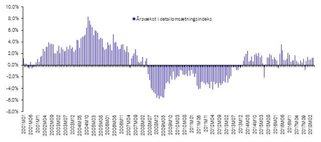 Igår fik vi tal for forbrugertilliden, der viste, at forbrugerne fortsat er i godt humør. Vi mangler dog for alvor at se den afsmittende effekt på andre forbrugsindikatorer som detailsalget og dankortomsætningen. Detailsalget har overordnet set godt nok været stigende hen over det seneste år, men væksten kunne godt have været større, når man samtidig betragter de nuværende privatøkonomiske forudsætninger. Flot beskæftigelsesudvikling og reallønsfremgangen har løftet humøret til et pænt niveau blandt de danske forbrugere, men det burde også være medvirkende til, at vi løfter vores forbrug mere. For tiden ser det dog ud til, at vi blot nøjes med at lade det smitte af på humøret, mens vi lader pengene blive i lommen.