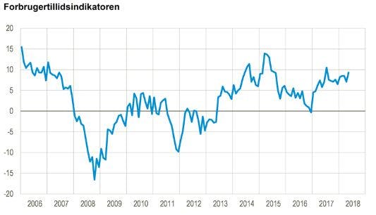 De nyeste tal viser, at forbrugertilliden ligger på 9,3 i maj sammenlignet med 7,1 i april. I 2018 har forbrugertilliden indtil nu ligget på 8,3 i gennemsnit – det er et pænt niveau, der isoleret set peger i retning af vækst i det private forbrug.
