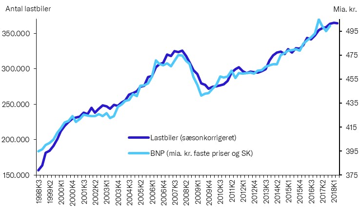 Svag fremgang i antal lastbiler over Storebælt indikerer, at væksten i dansk økonomi er gået et gear ned i starten af 2018.