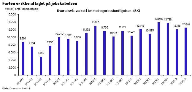 Torsdag offentliggjorde Danmarks Statistik nye tal for lønmodtagerbeskæftigelsen frem til og med september i år. I 3. kvartal steg lønmodtagerbeskæftigelsen med 12.600 personer, når der tages højde for effekten af sæson. Det er 500 flere end 2. kvartal, men dog lavere end jobskabelsen i 1. kvartal. Dermed synes den flotte udvikling i beskæftigelsen at have holdt sit tempo gennem 3. kvartal.
