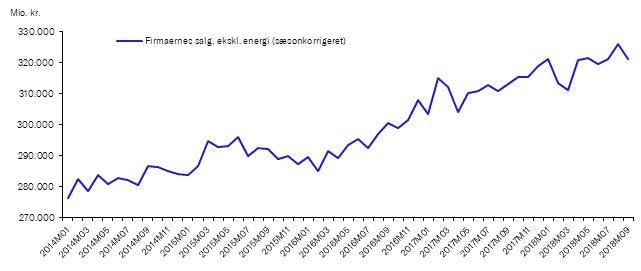 Virksomhedernes salg (ekskl. energi) bød i 3. kvartal på en fremgang på blot 0,7 pct. sammenlignet med 2. kvartal. Det er i den lave ende set i lyset af at der ikke er taget højde for prisudvikling. Det så ellers ud til at firmaernes salg var kommet tilbage på vækstsporet efter flot vækst i august, efter en noget skuffende udvikling i starten af året, der bød på tilbagegang i firmaernes salg. Den skuffende tilgang i september tyder på, at fremgangen i august blot var et enkeltstående fænomen. Forudsætninger for stigende afsætning for danske virksomheder er ellers overordnet set ret gode. Der er vækst på vores eksportmarkeder, og der er gode forudsætninger for fremgang i det private forbrug: rekord høj beskæftigelse, lav ledighed og stigende realløn.