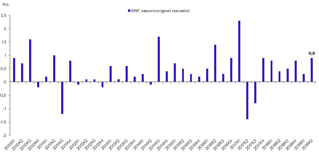 Der var vækst i det private forbrug på 0,3 pct. i 3. kvartal, hvilket er i den lave ende – specielt efter kvartalsvise vækstrater på over ½ pct. i de to første kvartaler af 2018. Der er ellers i øjeblikket også gode forudsætninger for fremgang i det private forbrug. Beskæftigelsen er rekordhøj, ledigheden er lav og reallønsvæksten er pæn.