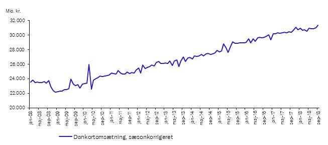 Nets har onsdag offentliggjort forbruget med dankort i september. Tallene viste at forbruget i september var 31,4 mia. kr., når man tager højde for sæsonudsving (Dansk Erhverv har sæsonkorrigeret tidsserien). Det er 1,2 pct. højere end i august. Det ser dermed ud til at danskernes forbrug er gået et gear op i august og september, efter mindre fald i juni og juli.