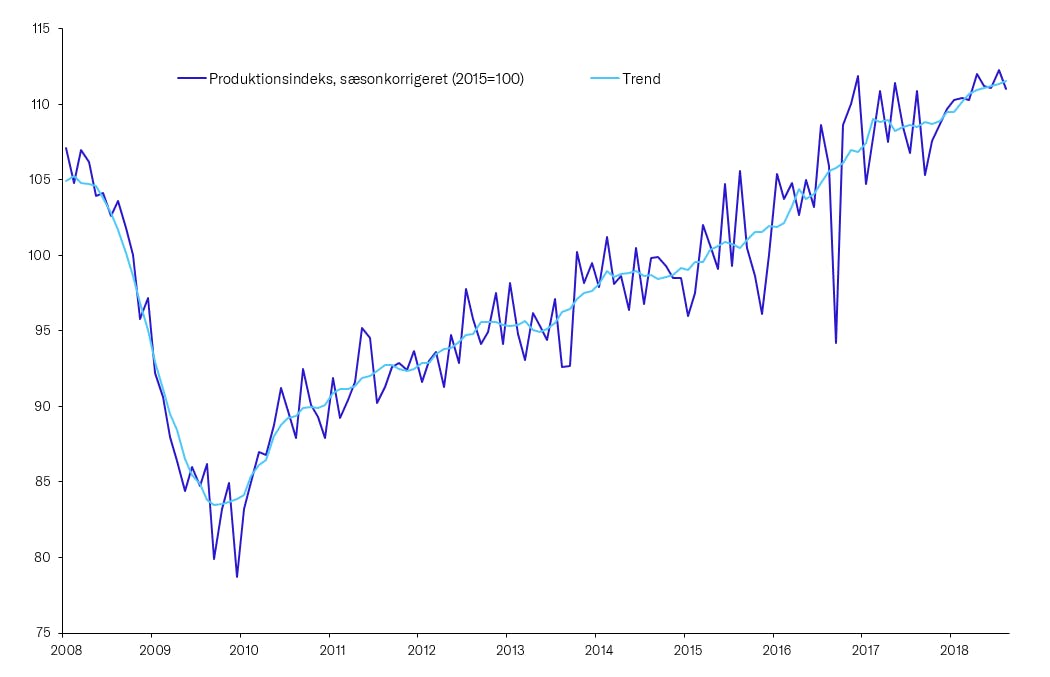 Industriproduktionen har været jævnt stigende igennem 2018, efter at have ligget ret stille gennem 2017. I de 3 seneste måneder har industriproduktionen ligget omkring 2,5 pct. højere end i samme periode sidste år. At produktionen er steget hen over det seneste år er selvfølgelig positivt, men også forventeligt set i lyset af det stærke globale opsving – herunder særligt på vores vigtigste afsætningsmarkeder.